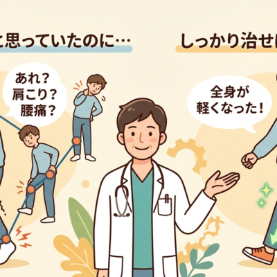 当院では、ただ今の痛みを取るだけでなく、**「元の正しい位置に骨を整え、正しく動かせるようにする」**ことを最も大切にしています。 それは、一生付き合っていく皆さんの体を、10年後、20年後も元気に保つためです。