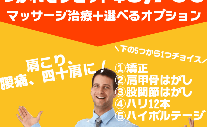 ①矯正②肩甲骨はがし③股関節はがし④ハリ12本⑤ハイボルテージ