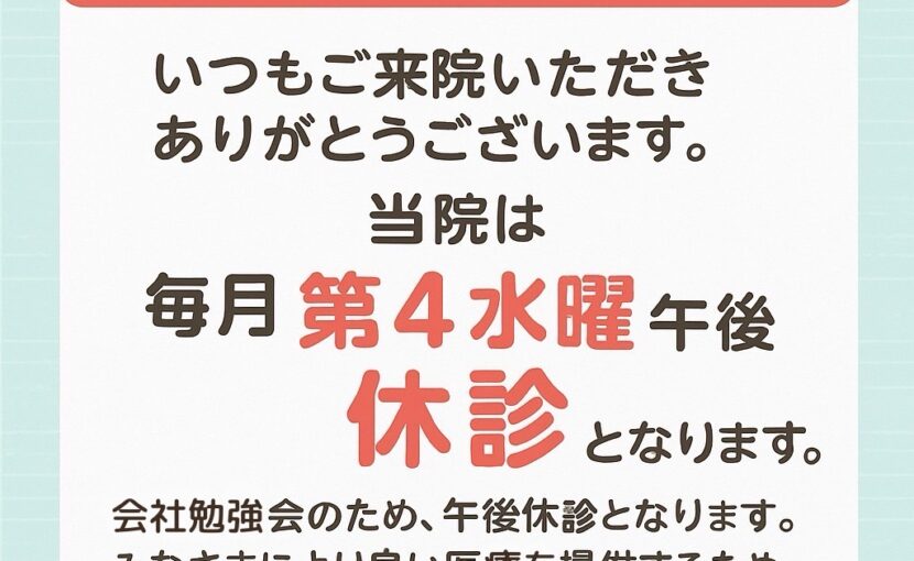 本日・第四水曜日は会社勉強会の為、午後休診となります。