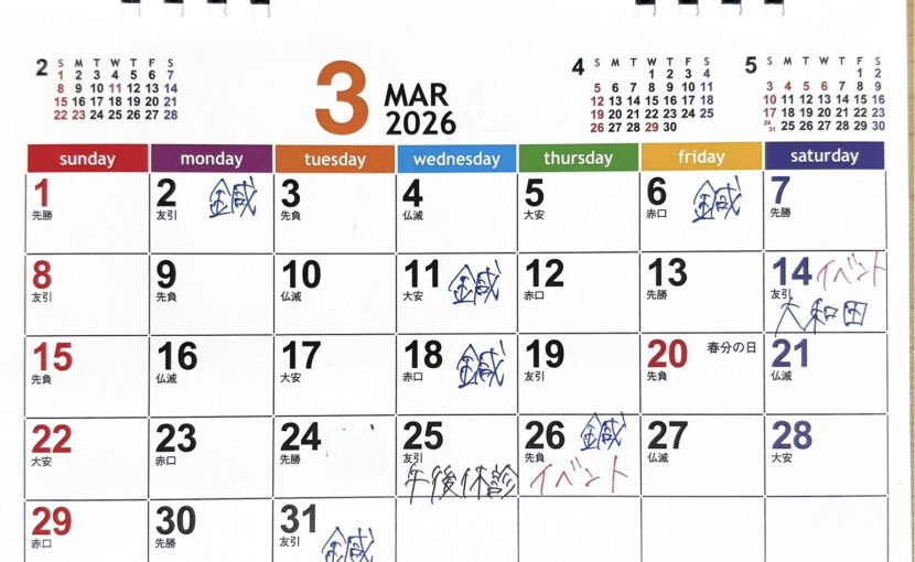 3月の予定表のお知らせ 2026.02.27 こんにちは🍀 3月の予定表ができましたのでお知らせいたします。 季節の変わり目は風邪をひきやすいので体調に気を付けてお過ごしください。 みなさまのご来院お待ちしております🏠